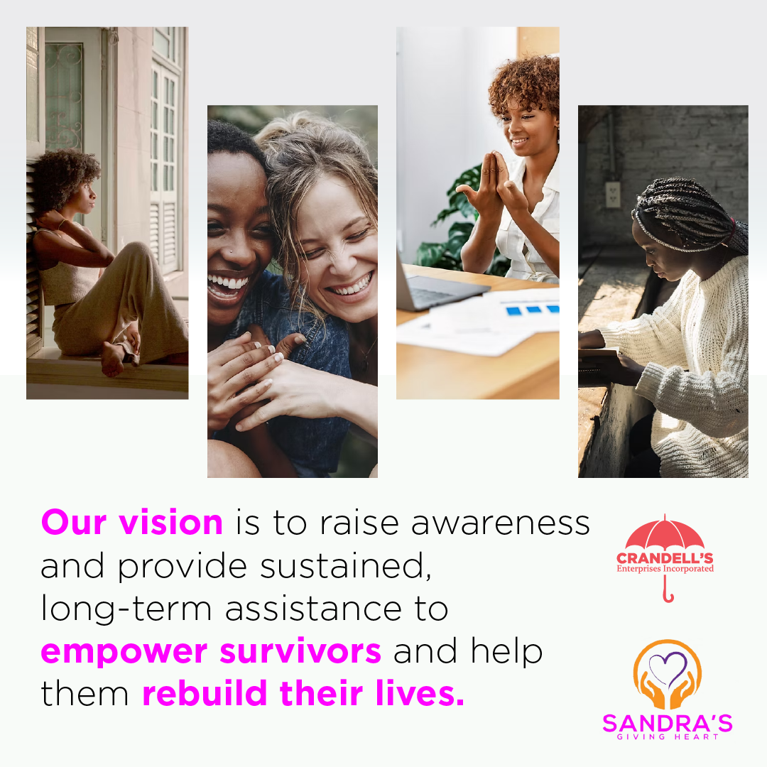 This is the mission of Sandra’s Giving Heart, founded by Sandra Mayo of Crandell’s Enterprises. Sandra’s Giving Heart is a nonprofit organization committed to supporting sex trafficking survivors, particularly teenage women who represent 30-50% of all victims. The organization provides access to mental health counseling, financial literacy, specialized therapy, transitional housing, and job-building skills and the critical resources and advocacy for sex trafficking victims. The vision is to raise awareness and offer long-term support to help survivors rebuild their lives.